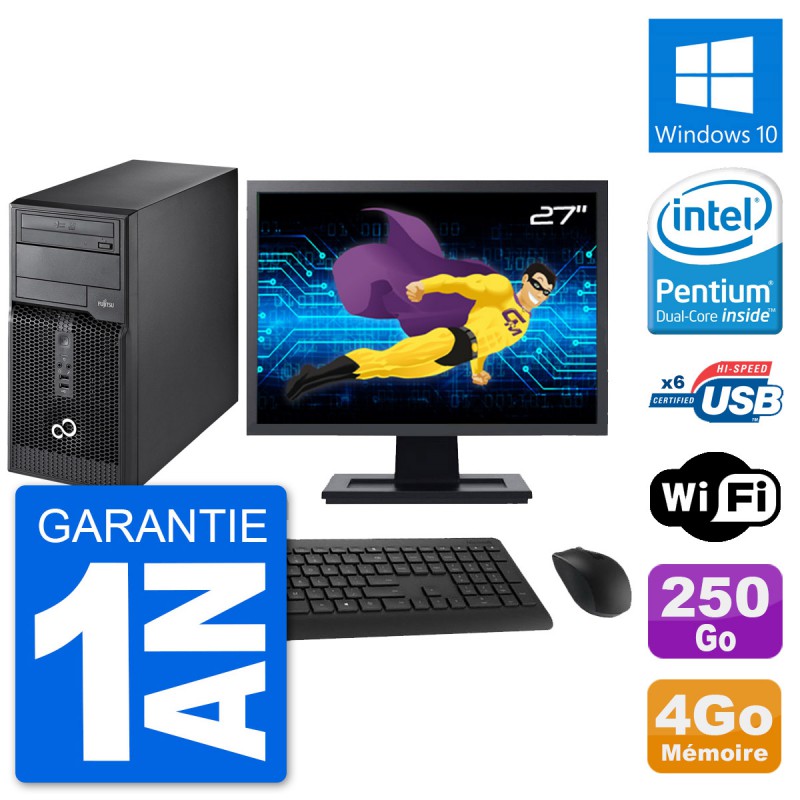 PC Tour Fujitsu P400 - Intel Pentium Dual-Core G630 2.7 Ghz (3 Mo) - 4 Go DDR3 - Disque Dur 3,5" 250 Go - Graveur DVD - Clef Wifi USB - Windows 10 - Livré avec Ecran 27" + clavier + souris (Marques et modèles variables) - Garantie 1 an.