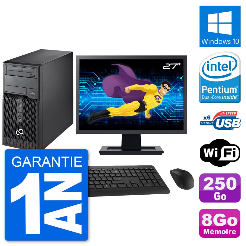 PC Tour Fujitsu P400 - Intel Pentium Dual-Core G630 2.7 Ghz (3 Mo) - 8 Go DDR3 - Disque Dur 3,5" 250 Go - Graveur DVD - Clef Wifi USB - Windows 10 - Livré avec Ecran 27" + clavier + souris (Marques et modèles variables) - Garantie 1 an.