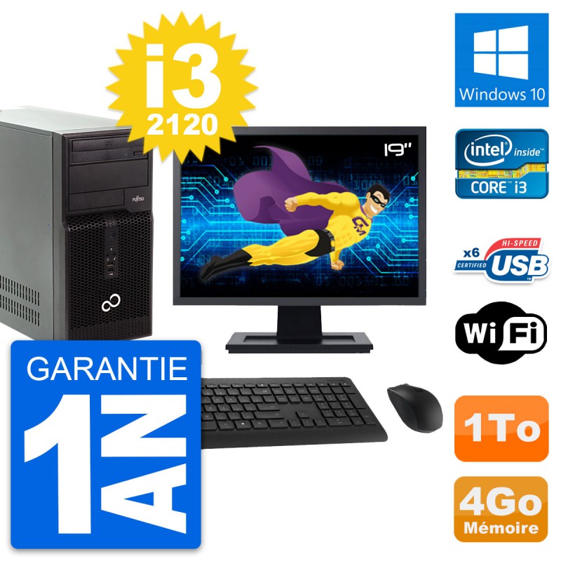PC Tour Fujitsu P400 Ecran 19" Intel i3-2120 RAM 4Go Disque 1To Windows 10 Wifi