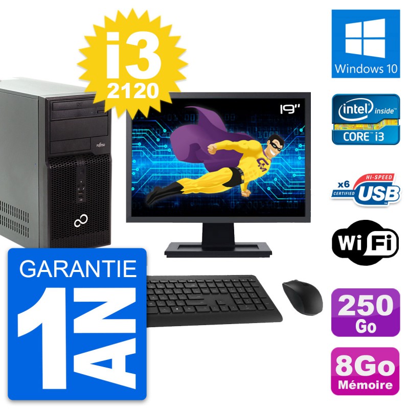 PC Tour Fujitsu P400 - Intel Core i3-2120 3.3 Ghz (3 Mo) - 8 Go DDR3 - Disque Dur 3,5" 250 Go - Graveur DVD - Clef Wifi USB - Windows 10 - Livré avec Ecran 19" + clavier + souris (Marques et modèles variables) - Garantie 1 an.