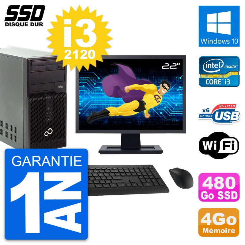 PC Tour Fujitsu P400 - Intel Core i3-2120 3.3 Ghz (3 Mo) - 4 Go DDR3 - Disque Dur SSD 480 Go - Graveur DVD - Clef Wifi USB - Windows 10 - Livré avec Ecran 22" + clavier + souris (Marques et modèles variables) - Garantie 1 an.
