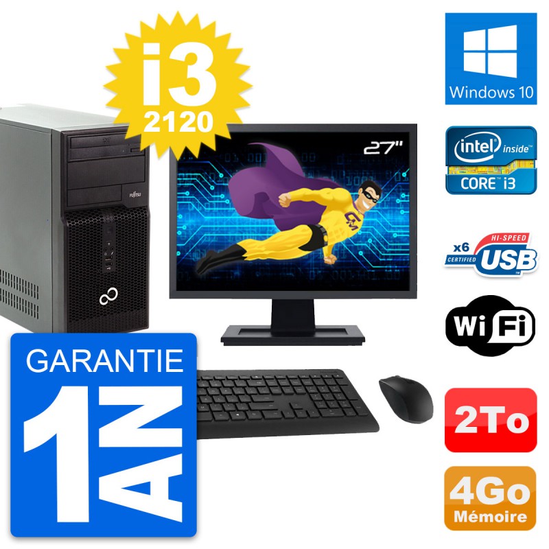 PC Tour Fujitsu P400 - Intel Core i3-2120 3.3 Ghz (3 Mo) - 4 Go DDR3 - Disque Dur 3,5" 2 To - Graveur DVD - Clef Wifi USB - Windows 10 - Livré avec Ecran 27" + clavier + souris (Marques et modèles variables) - Garantie 1 an.