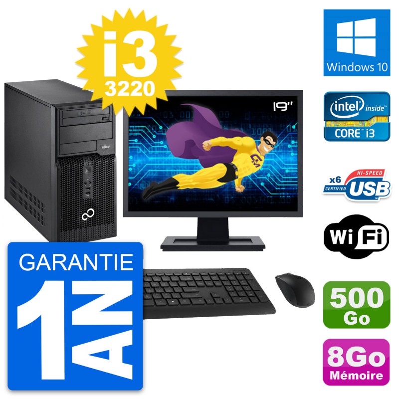 PC Tour Fujitsu P400 - Intel Core i3-3220 3.3 Ghz (3 Mo) - 8 Go DDR3 - Disque Dur 3,5" 500 Go - Graveur DVD - Clef Wifi USB - Windows 10 - Livré avec Ecran 19" + clavier + souris (Marques et modèles variables) - Garantie 1 an.