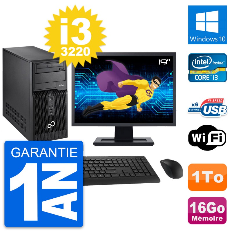 PC Tour Fujitsu P400 - Intel Core i3-3220 3.3 Ghz (3 Mo) - 16 Go DDR3 - Disque Dur 3,5" 1 To - Graveur DVD - Clef Wifi USB - Windows 10 - Livré avec Ecran 19" + clavier + souris (Marques et modèles variables) - Garantie 1 an.