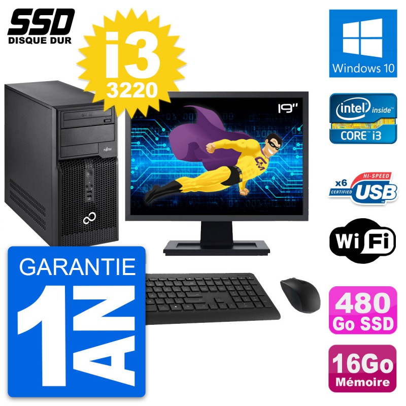 PC Tour Fujitsu P400 - Intel Core i3-3220 3.3 Ghz (3 Mo) - 16 Go DDR3 - Disque Dur SSD 480 Go - Graveur DVD - Clef Wifi USB - Windows 10 - Livré avec Ecran 19" + clavier + souris (Marques et modèles variables) - Garantie 1 an.