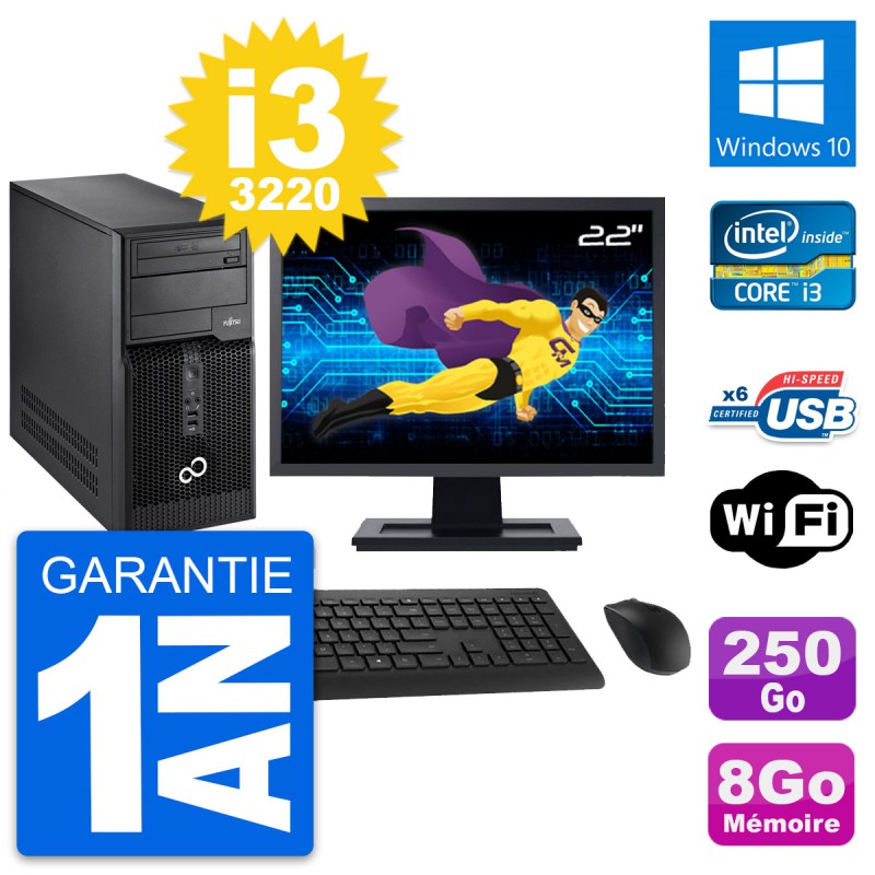 PC Tour Fujitsu P400 - Intel Core i3-3220 3.3 Ghz (3 Mo) - 8 Go DDR3 - Disque Dur 3,5" 250 Go - Graveur DVD - Clef Wifi USB - Windows 10 - Livré avec Ecran 22" + clavier + souris (Marques et modèles variables) - Garantie 1 an.