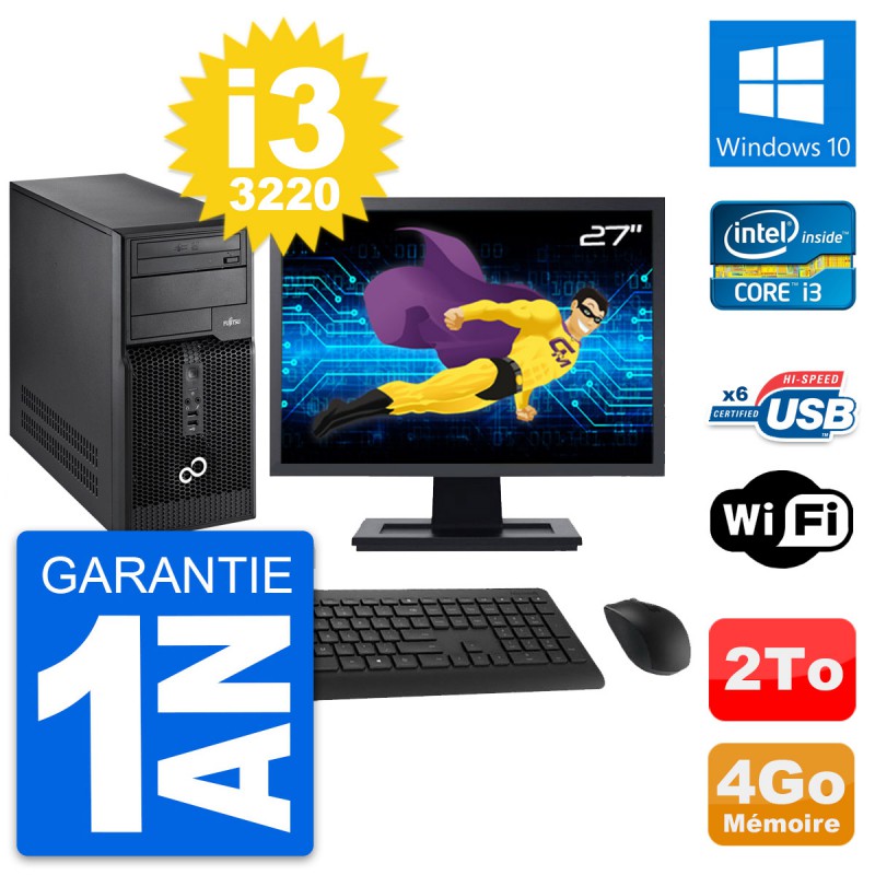 PC Tour Fujitsu P400 - Intel Core i3-3220 3.3 Ghz (3 Mo) - 4 Go DDR3 - Disque Dur 3,5" 2 To - Graveur DVD - Clef Wifi USB - Windows 10 - Livré avec Ecran 27" + clavier + souris (Marques et modèles variables) - Garantie 1 an.