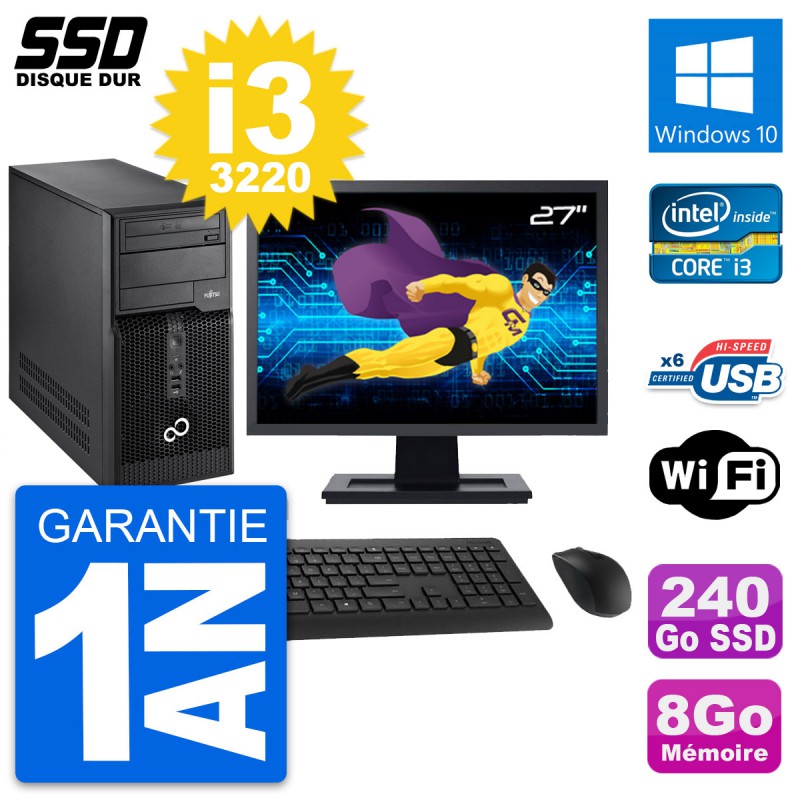 PC Tour Fujitsu P400 - Intel Core i3-3220 3.3 Ghz (3 Mo) - 8 Go DDR3 - Disque Dur SSD 240 Go - Graveur DVD - Clef Wifi USB - Windows 10 - Livré avec Ecran 27" + clavier + souris (Marques et modèles variables) - Garantie 1 an.