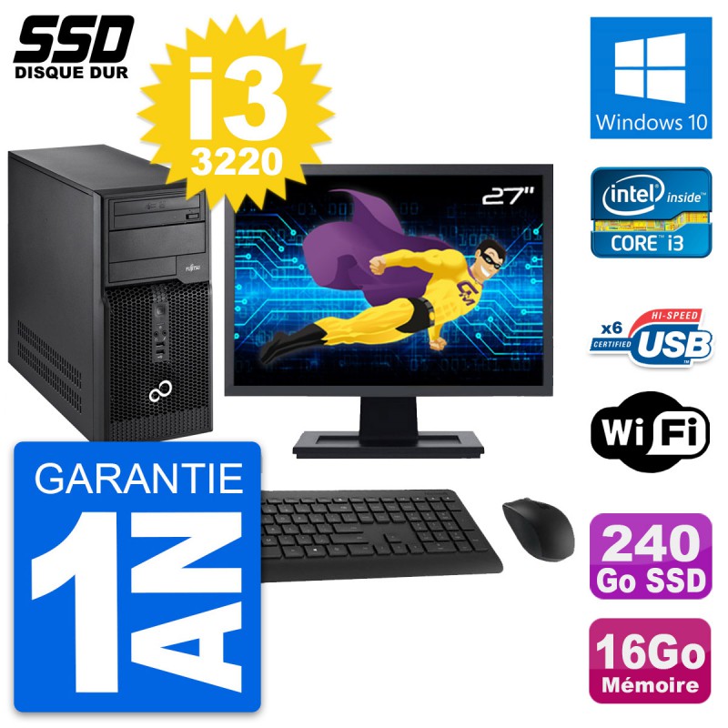 PC Tour Fujitsu P400 - Intel Core i3-3220 3.3 Ghz (3 Mo) - 16 Go DDR3 - Disque Dur SSD 240 Go - Graveur DVD - Clef Wifi USB - Windows 10 - Livré avec Ecran 27" + clavier + souris (Marques et modèles variables) - Garantie 1 an.