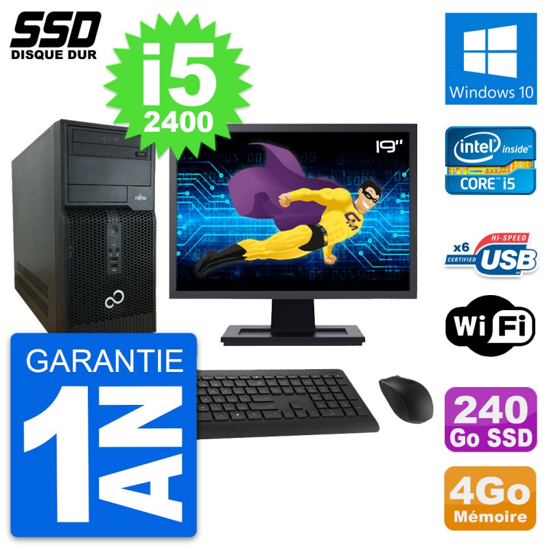 PC Tour Fujitsu P400 - Intel Core i5-2400 3.1 Ghz (6 Mo) - 4 Go DDR3 - Disque Dur SSD 240 Go - Graveur DVD - Clef Wifi USB - Windows 10 - Livré avec Ecran 19" + clavier + souris (Marques et modèles variables) - Garantie 1 an.