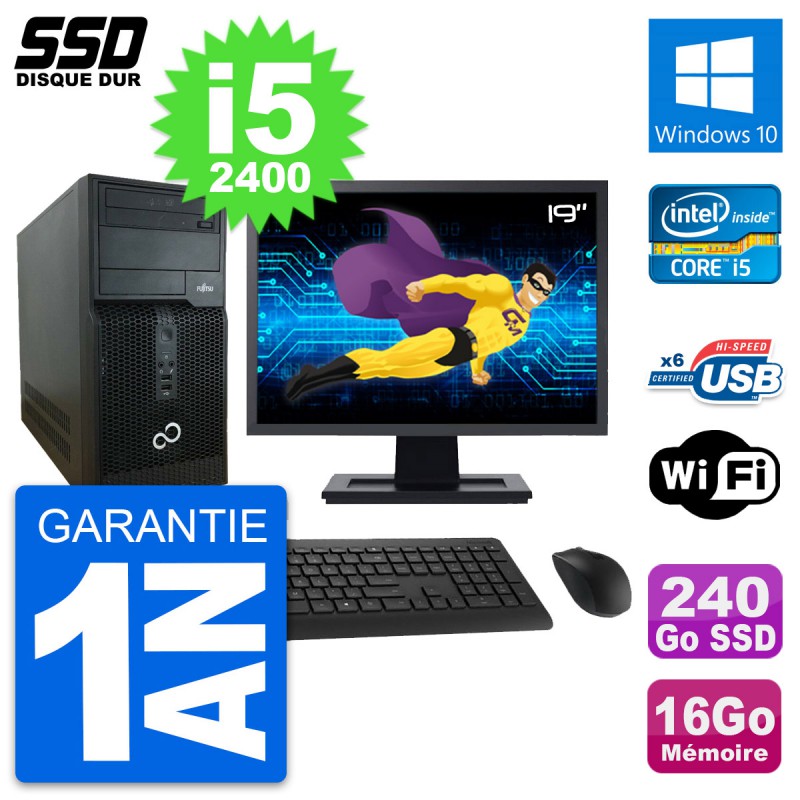 PC Tour Fujitsu P400 - Intel Core i5-2400 3.1 Ghz (6 Mo) - 16 Go DDR3 - Disque Dur SSD 240 Go - Graveur DVD - Clef Wifi USB - Windows 10 - Livré avec Ecran 19" + clavier + souris (Marques et modèles variables) - Garantie 1 an.