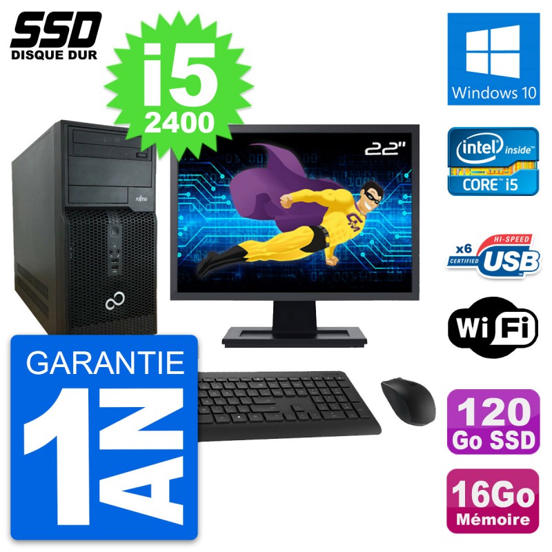 PC Tour Fujitsu P400 - Intel Core i5-2400 3.1 Ghz (6 Mo) - 16 Go DDR3 - Disque Dur SSD 120 Go - Graveur DVD - Clef Wifi USB - Windows 10 - Livré avec Ecran 22" + clavier + souris (Marques et modèles variables) - Garantie 1 an.
