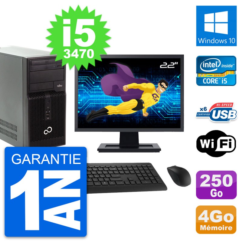 PC Tour Fujitsu P400 - Intel Core i5-3470 3.2 Ghz (6 Mo) - 4 Go DDR3 - Disque Dur 3,5" 250 Go - Graveur DVD - Clef Wifi USB - Windows 10 - Livré avec Ecran 22" + clavier + souris (Marques et modèles variables) - Garantie 1 an.
