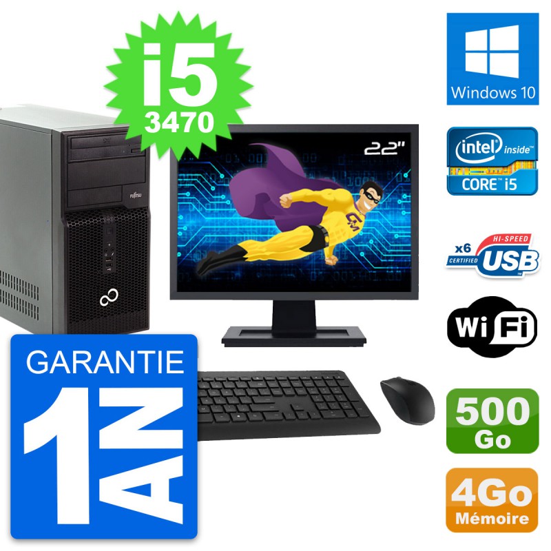 PC Tour Fujitsu P400 - Intel Core i5-3470 3.2 Ghz (6 Mo) - 4 Go DDR3 - Disque Dur 3,5" 500 Go - Graveur DVD - Clef Wifi USB - Windows 10 - Livré avec Ecran 22" + clavier + souris (Marques et modèles variables) - Garantie 1 an.