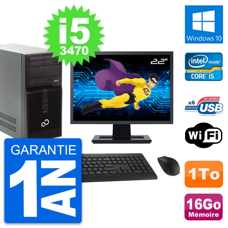 PC Tour Fujitsu P400 - Intel Core i5-3470 3.2 Ghz (6 Mo) - 16 Go DDR3 - Disque Dur 3,5" 1 To - Graveur DVD - Clef Wifi USB - Windows 10 - Livré avec Ecran 22" + clavier + souris (Marques et modèles variables) - Garantie 1 an.