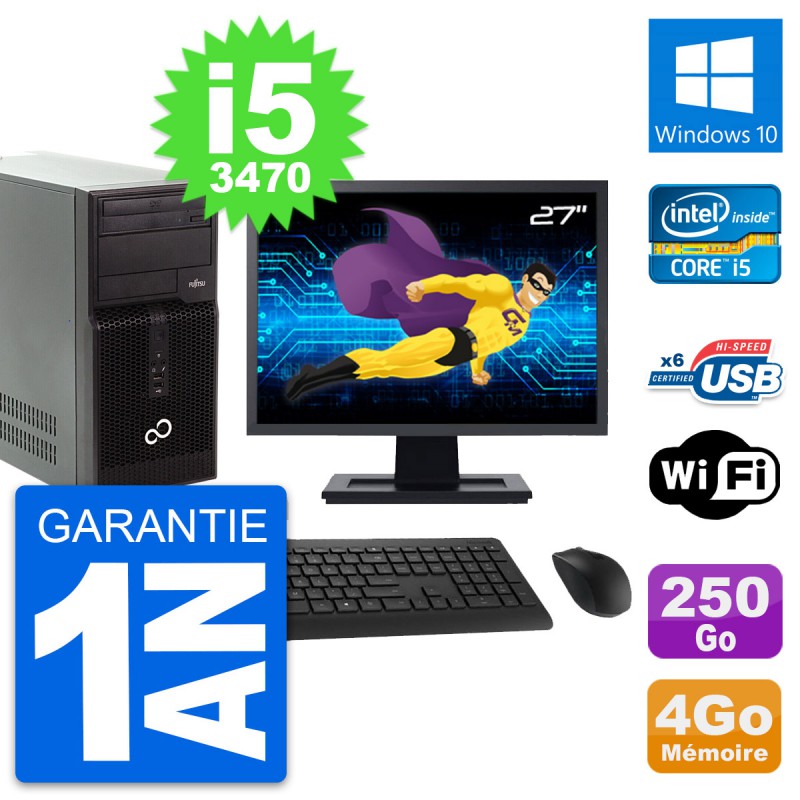 PC Tour Fujitsu P400 - Intel Core i5-3470 3.2 Ghz (6 Mo) - 4 Go DDR3 - Disque Dur 3,5" 250 Go - Graveur DVD - Clef Wifi USB - Windows 10 - Livré avec Ecran 27" + clavier + souris (Marques et modèles variables) - Garantie 1 an.