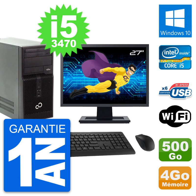 PC Tour Fujitsu P400 - Intel Core i5-3470 3.2 Ghz (6 Mo) - 4 Go DDR3 - Disque Dur 3,5" 500 Go - Graveur DVD - Clef Wifi USB - Windows 10 - Livré avec Ecran 27" + clavier + souris (Marques et modèles variables) - Garantie 1 an.