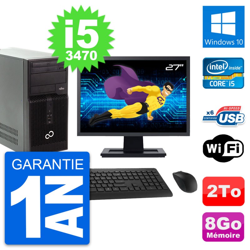 PC Tour Fujitsu P400 - Intel Core i5-3470 3.2 Ghz (6 Mo) - 8 Go DDR3 - Disque Dur 3,5" 2 To - Graveur DVD - Clef Wifi USB - Windows 10 - Livré avec Ecran 27" + clavier + souris (Marques et modèles variables) - Garantie 1 an.