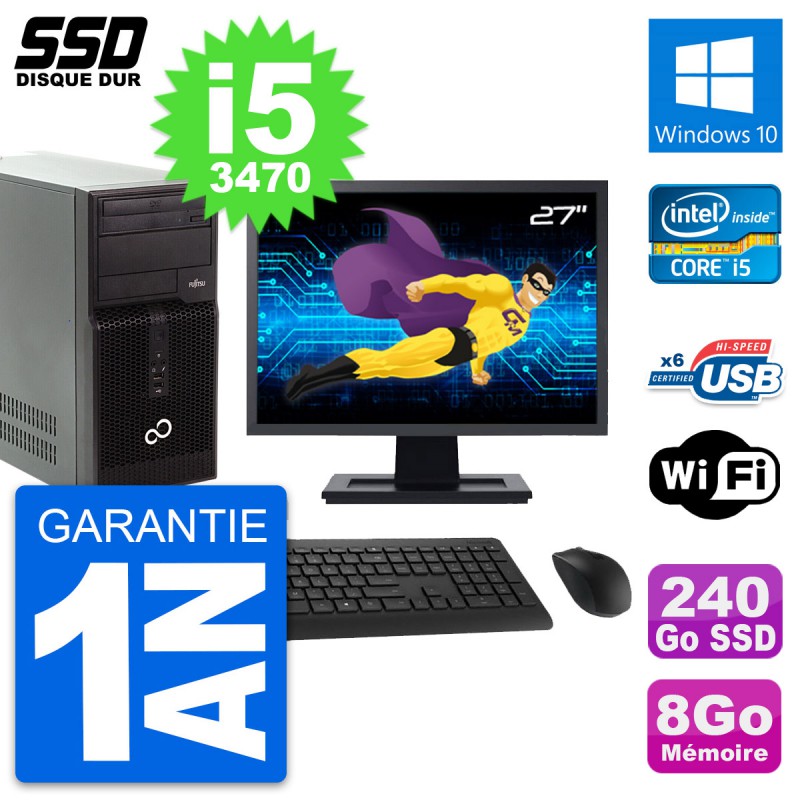 PC Tour Fujitsu P400 - Intel Core i5-3470 3.2 Ghz (6 Mo) - 8 Go DDR3 - Disque Dur SSD 240 Go - Graveur DVD - Clef Wifi USB - Windows 10 - Livré avec Ecran 27" + clavier + souris (Marques et modèles variables) - Garantie 1 an.