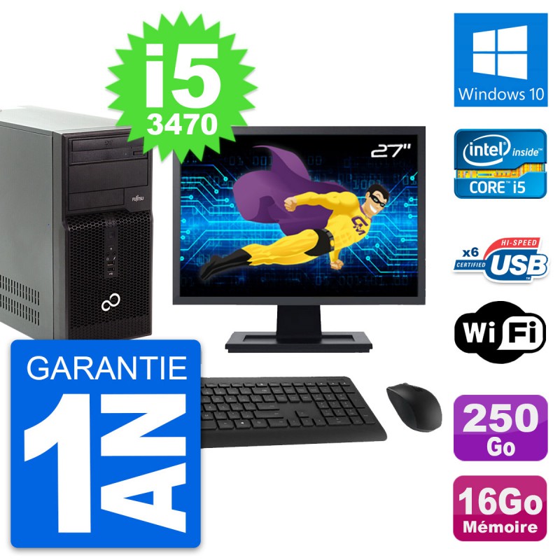 PC Tour Fujitsu P400 - Intel Core i5-3470 3.2 Ghz (6 Mo) - 16 Go DDR3 - Disque Dur 3,5" 250 Go - Graveur DVD - Clef Wifi USB - Windows 10 - Livré avec Ecran 27" + clavier + souris (Marques et modèles variables) - Garantie 1 an.