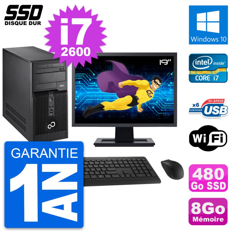 PC Tour Fujitsu P400 Ecran 19" Intel i7-2600 RAM 8Go SSD 480Go Windows 10 Wifi