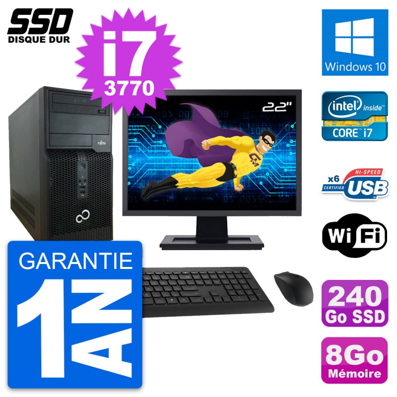 PC Tour Fujitsu P400 - Intel Core i7-3770 3.4 Ghz (8 Mo) - 8 Go DDR3 - Disque Dur SSD 240 Go - Graveur DVD - Clef Wifi USB - Windows 10 - Livré avec Ecran 22" + clavier + souris (Marques et modèles variables) - Garantie 1 an.