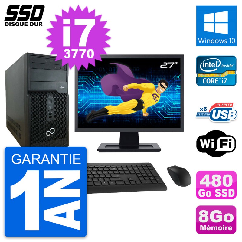 PC Tour Fujitsu P400 - Intel Core i7-3770 3.4 Ghz (8 Mo) - 8 Go DDR3 - Disque Dur SSD 480 Go - Graveur DVD - Clef Wifi USB - Windows 10 - Livré avec Ecran 27" + clavier + souris (Marques et modèles variables) - Garantie 1 an.