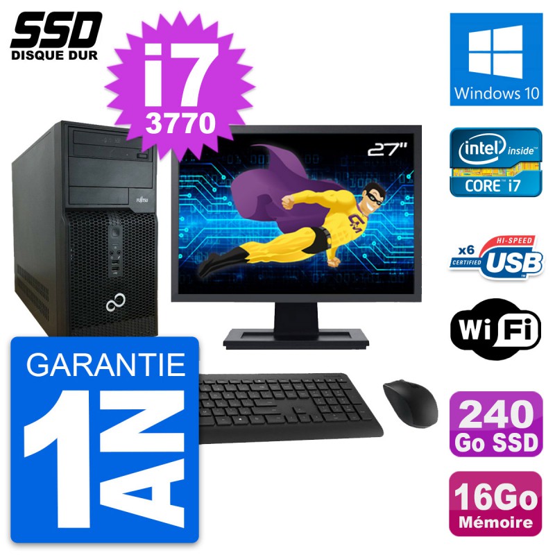 PC Tour Fujitsu P400 - Intel Core i7-3770 3.4 Ghz (8 Mo) - 16 Go DDR3 - Disque Dur SSD 240 Go - Graveur DVD - Clef Wifi USB - Windows 10 - Livré avec Ecran 27" + clavier + souris (Marques et modèles variables) - Garantie 1 an.