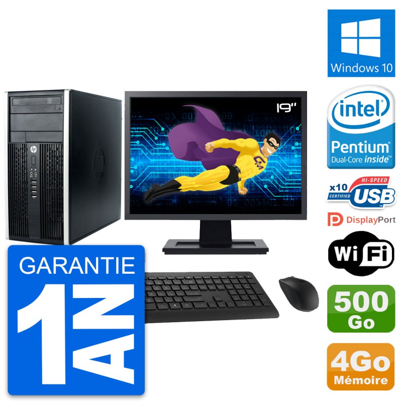 PC HP Pro 6300 CMT (Micro Tour) - Intel Pentium Dual-Core G630 2.7 Ghz (3 Mo) - 4 Go DDR3 - Disque Dur 3,5" 500 Go - Graveur DVD - Clef Wifi USB - Windows 10 - Livré avec Ecran 19" + clavier + souris (Marques et modèles variables) - Garantie 1 an.