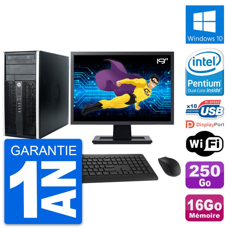 PC HP Pro 6300 CMT (Micro Tour) - Intel Pentium Dual-Core G630 2.7 Ghz (3 Mo) - 16 Go DDR3 - Disque Dur 3,5" 250 Go - Graveur DVD - Clef Wifi USB - Windows 10 - Livré avec Ecran 19" + clavier + souris (Marques et modèles variables) - Garantie 1 an.