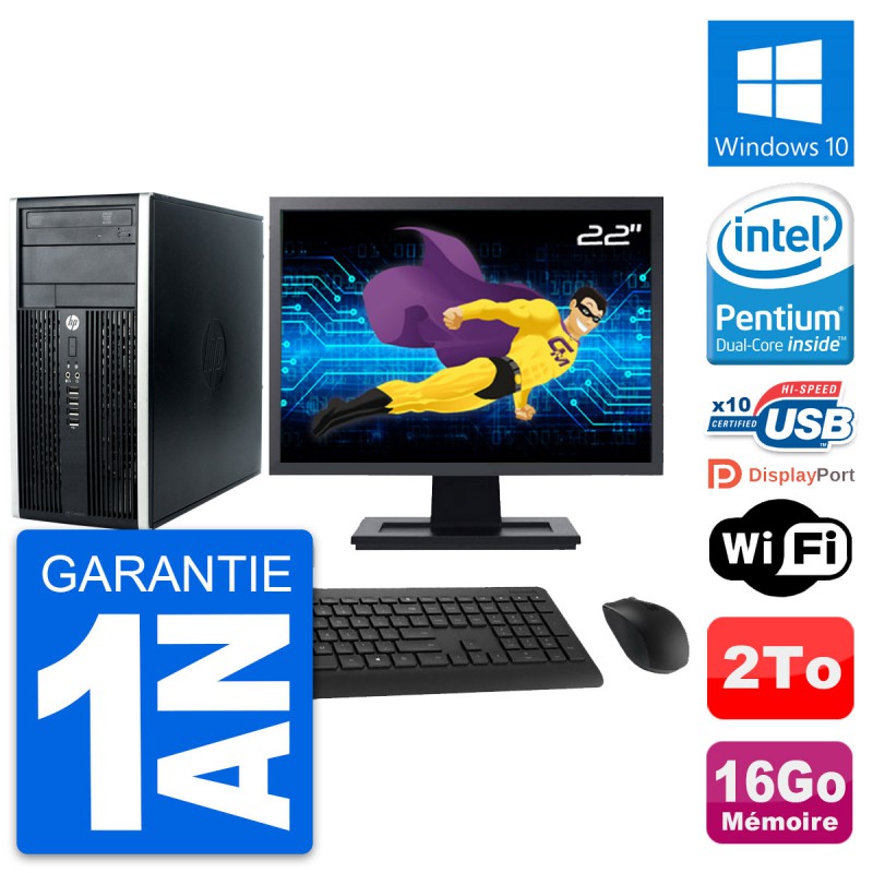PC HP Pro 6300 CMT (Micro Tour) - Intel Pentium Dual-Core G630 2.7 Ghz (3 Mo) - 16 Go DDR3 - Disque Dur 3,5" 2 To - Graveur DVD - Clef Wifi USB - Windows 10 - Livré avec Ecran 22" + clavier + souris (Marques et modèles variables) - Garantie 1 an.
