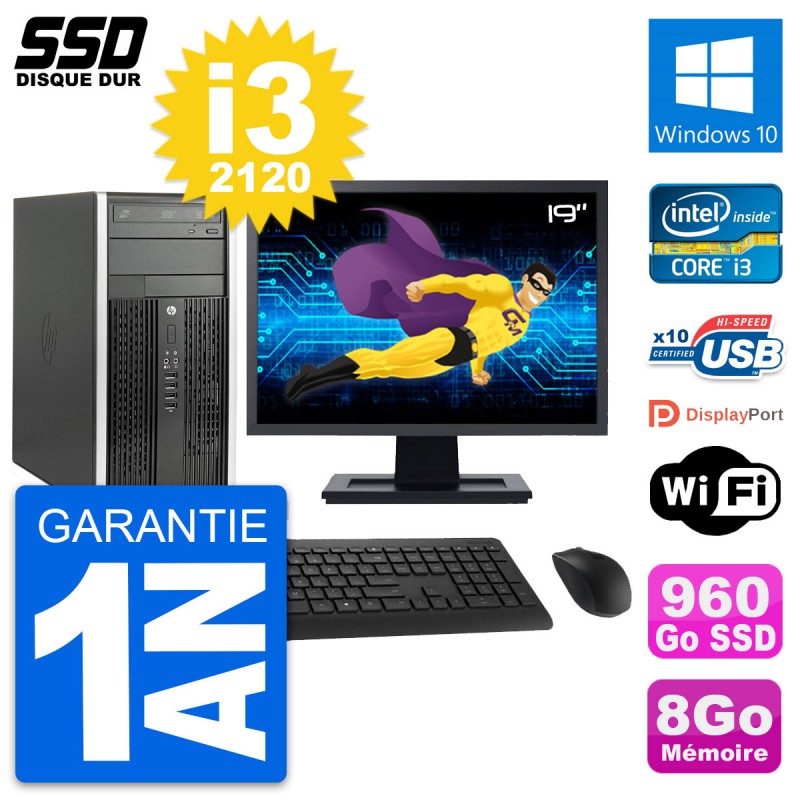 PC HP Pro 6300 CMT (Micro Tour) - Intel Core i3-2120 3.3 Ghz (3 Mo) - 8 Go DDR3 - Disque Dur SSD 960 Go - Graveur DVD - Clef Wifi USB - Windows 10 - Livré avec Ecran 19" + clavier + souris (Marques et modèles variables) - Garantie 1 an.