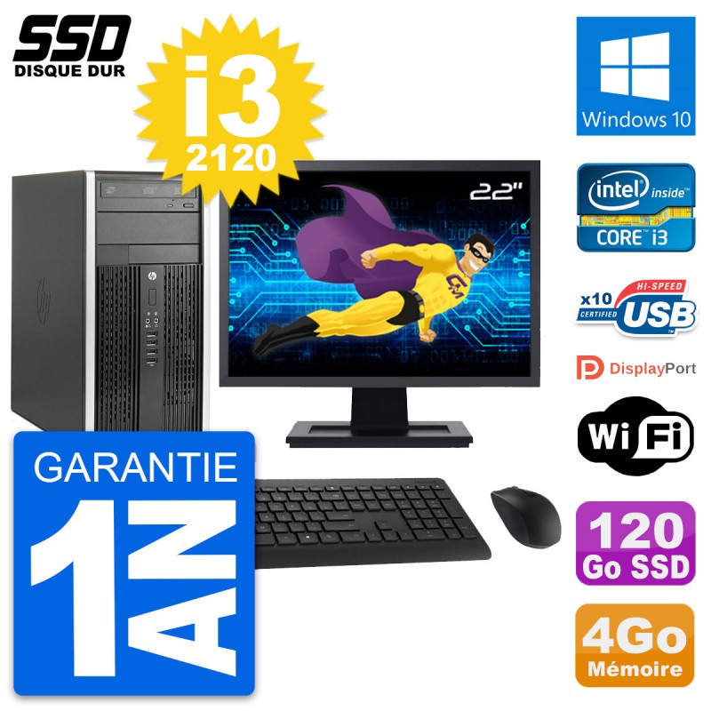 PC HP Pro 6300 CMT (Micro Tour) - Intel Core i3-2120 3.3 Ghz (3 Mo) - 4 Go DDR3 - Disque Dur SSD 120 Go - Graveur DVD - Clef Wifi USB - Windows 10 - Livré avec Ecran 22" + clavier + souris (Marques et modèles variables) - Garantie 1 an.