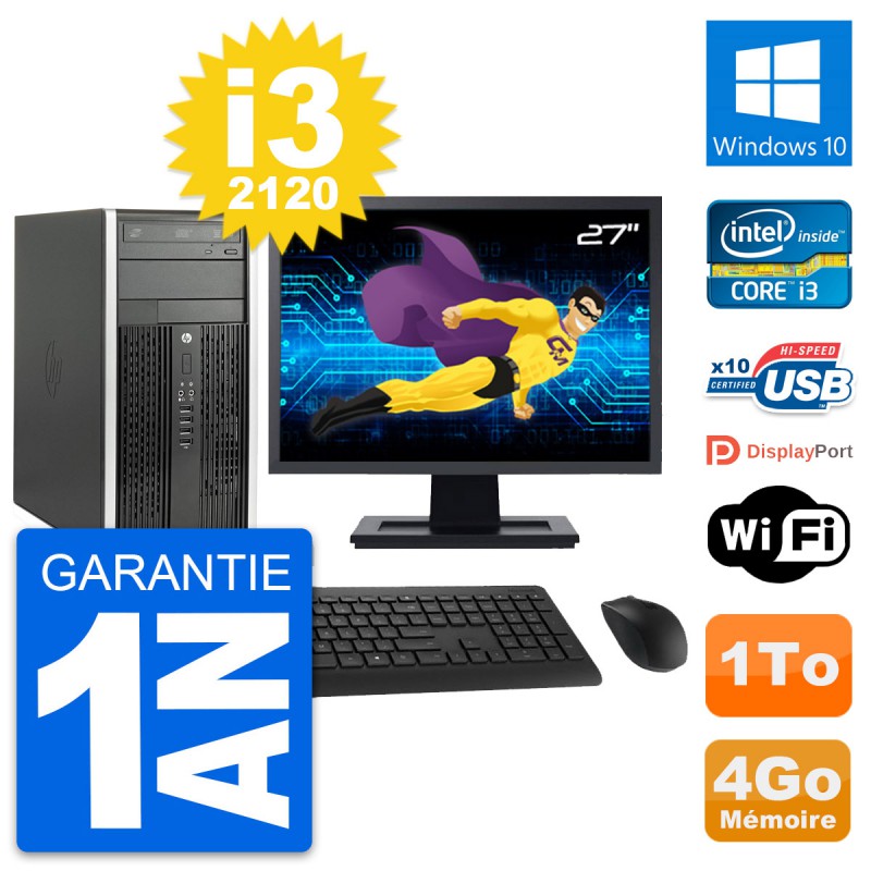 PC HP Pro 6300 CMT (Micro Tour) - Intel Core i3-2120 3.3 Ghz (3 Mo) - 4 Go DDR3 - Disque Dur 3,5" 1 To - Graveur DVD - Clef Wifi USB - Windows 10 - Livré avec Ecran 27" + clavier + souris (Marques et modèles variables) - Garantie 1 an.