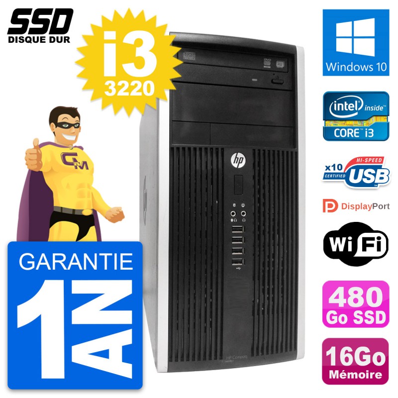 PC Tour HP Compaq Pro 6300 CMT (Micro Tour) - Intel Core i3-3220 3.3 Ghz (3 Mo) - 16 Go DDR3 - Disque Dur SSD 480 Go - Graveur DVD - Clef Wifi USB - Windows 10 - Garantie 1 an.