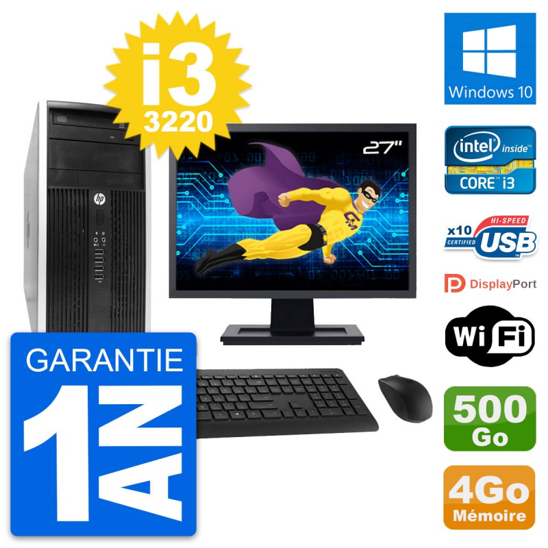 PC HP Pro 6300 CMT (Micro Tour) - Intel Core i3-3220 3.3 Ghz (3 Mo) - 4 Go DDR3 - Disque Dur 3,5" 500 Go - Graveur DVD - Clef Wifi USB - Windows 10 - Livré avec Ecran 27" + clavier + souris (Marques et modèles variables) - Garantie 1 an.