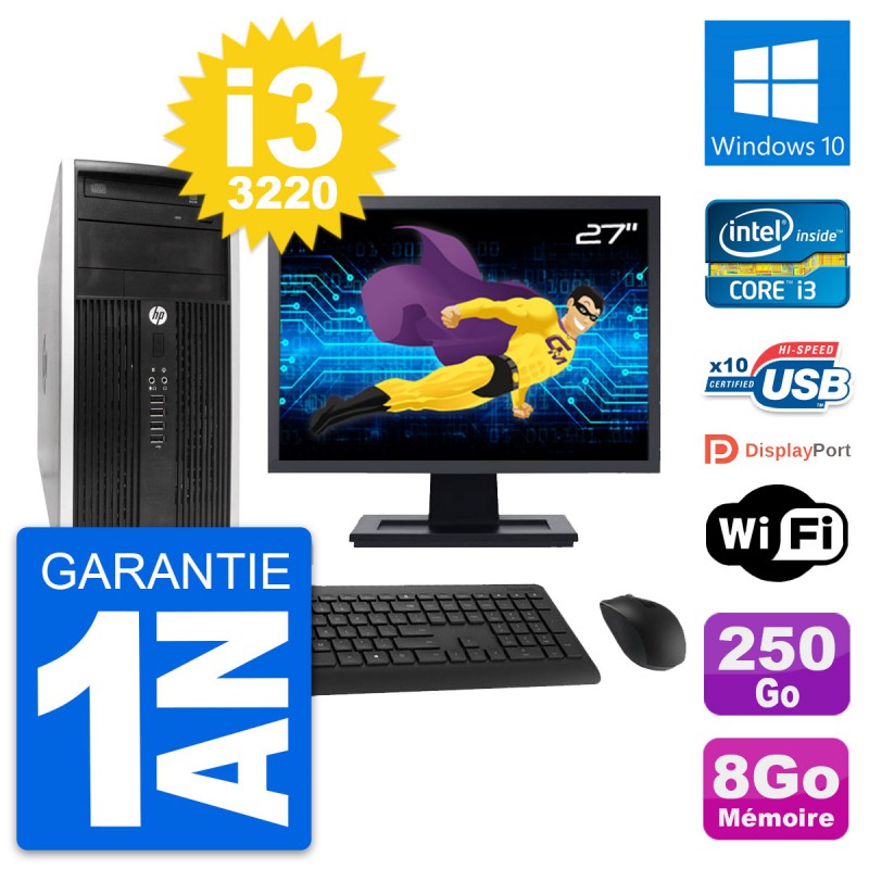PC HP Pro 6300 CMT (Micro Tour) - Intel Core i3-3220 3.3 Ghz (3 Mo) - 8 Go DDR3 - Disque Dur 3,5" 250 Go - Graveur DVD - Clef Wifi USB - Windows 10 - Livré avec Ecran 27" + clavier + souris (Marques et modèles variables) - Garantie 1 an.