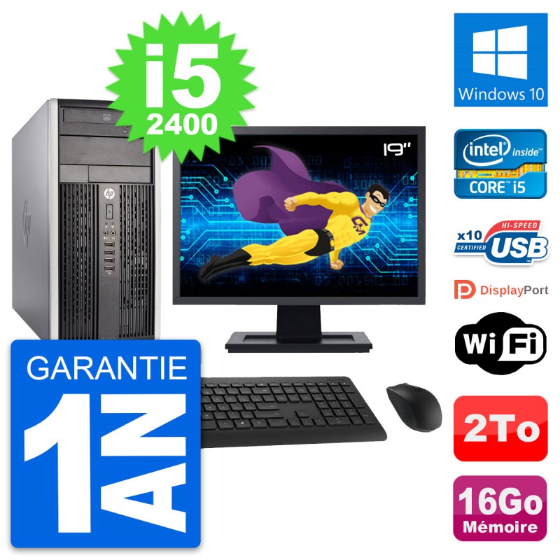 PC HP Pro 6300 CMT (Micro Tour) - Intel Core i5-2400 3.1 Ghz (6 Mo) - 16 Go DDR3 - Disque Dur 3,5" 2 To - Graveur DVD - Clef Wifi USB - Windows 10 - Livré avec Ecran 19" + clavier + souris (Marques et modèles variables) - Garantie 1 an.