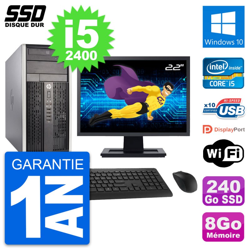 PC HP Pro 6300 CMT (Micro Tour) - Intel Core i5-2400 3.1 Ghz (6 Mo) - 8 Go DDR3 - Disque Dur SSD 240 Go - Graveur DVD - Clef Wifi USB - Windows 10 - Livré avec Ecran 22" + clavier + souris (Marques et modèles variables) - Garantie 1 an.