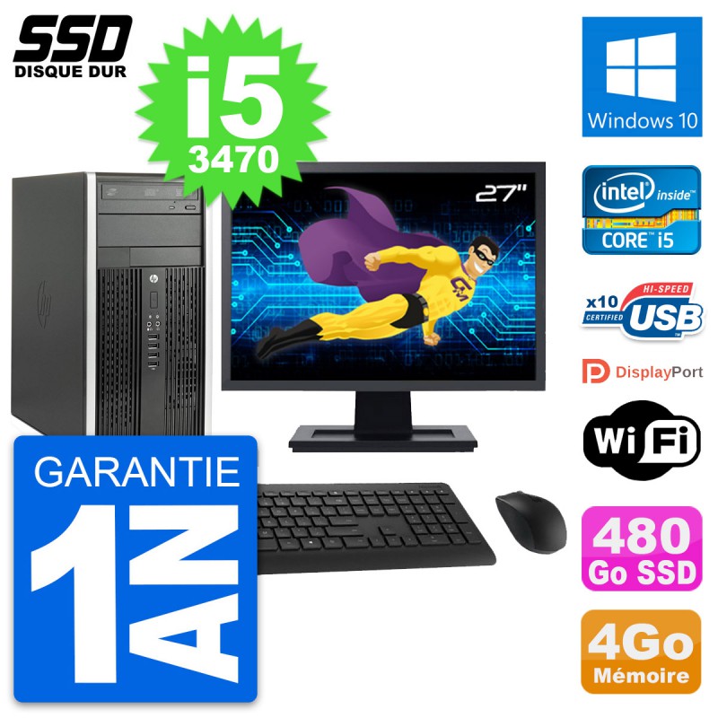 PC HP Pro 6300 CMT (Micro Tour) - Intel Core i5-3470 3.2 Ghz (6 Mo) - 4 Go DDR3 - Disque Dur SSD 480 Go - Graveur DVD - Clef Wifi USB - Windows 10 - Livré avec Ecran 27" + clavier + souris (Marques et modèles variables) - Garantie 1 an.