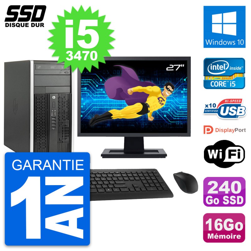PC HP Pro 6300 CMT (Micro Tour) - Intel Core i5-3470 3.2 Ghz (6 Mo) - 16 Go DDR3 - Disque Dur SSD 240 Go - Graveur DVD - Clef Wifi USB - Windows 10 - Livré avec Ecran 27" + clavier + souris (Marques et modèles variables) - Garantie 1 an.