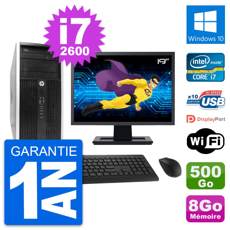 PC HP Pro 6300 CMT (Micro Tour) - Intel Core i7-2600 3.4 Ghz (8 Mo) - 8 Go DDR3 - Disque Dur 3,5" 500 Go - Graveur DVD - Clef Wifi USB - Windows 10 - Livré avec Ecran 19" + clavier + souris (Marques et modèles variables) - Garantie 1 an.
