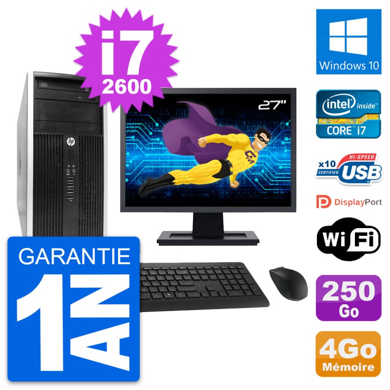 PC HP Pro 6300 CMT (Micro Tour) - Intel Core i7-2600 3.4 Ghz (8 Mo) - 4 Go DDR3 - Disque Dur 3,5" 250 Go - Graveur DVD - Clef Wifi USB - Windows 10 - Livré avec Ecran 27" + clavier + souris (Marques et modèles variables) - Garantie 1 an.