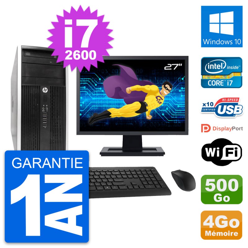 PC HP Pro 6300 CMT (Micro Tour) - Intel Core i7-2600 3.4 Ghz (8 Mo) - 4 Go DDR3 - Disque Dur 3,5" 500 Go - Graveur DVD - Clef Wifi USB - Windows 10 - Livré avec Ecran 27" + clavier + souris (Marques et modèles variables) - Garantie 1 an.