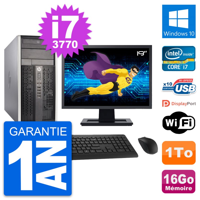 PC HP Pro 6300 CMT (Micro Tour) - Intel Core i7-3770 3.4 Ghz (8 Mo) - 16 Go DDR3 - Disque Dur 3,5" 1 To - Graveur DVD - Clef Wifi USB - Windows 10 - Livré avec Ecran 19" + clavier + souris (Marques et modèles variables) - Garantie 1 an.