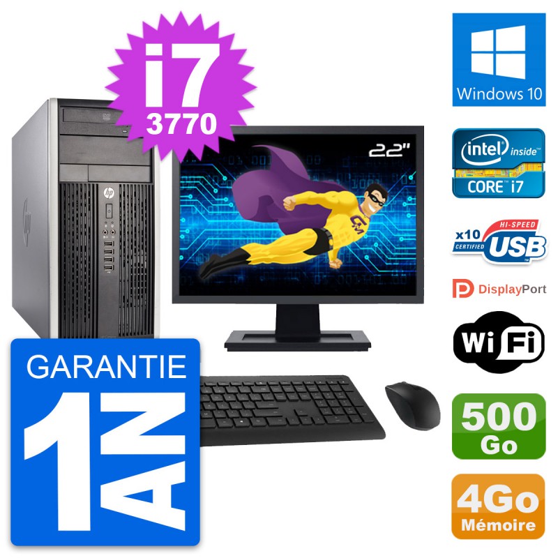 PC HP Pro 6300 CMT (Micro Tour) - Intel Core i7-3770 3.4 Ghz (8 Mo) - 4 Go DDR3 - Disque Dur 3,5" 500 Go - Graveur DVD - Clef Wifi USB - Windows 10 - Livré avec Ecran 22" + clavier + souris (Marques et modèles variables) - Garantie 1 an.