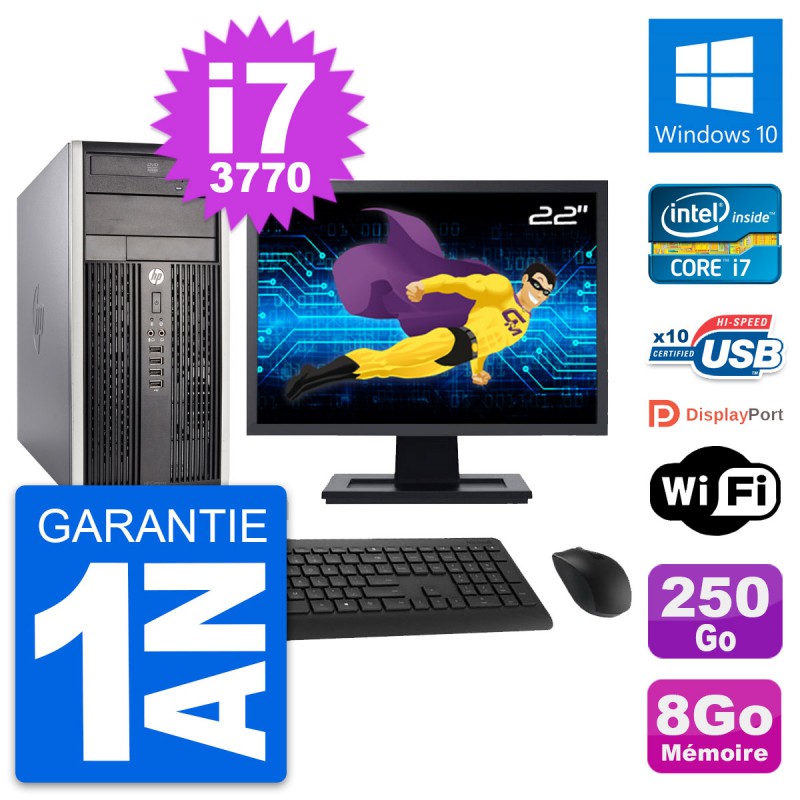 PC HP Pro 6300 CMT (Micro Tour) - Intel Core i7-3770 3.4 Ghz (8 Mo) - 8 Go DDR3 - Disque Dur 3,5" 250 Go - Graveur DVD - Clef Wifi USB - Windows 10 - Livré avec Ecran 22" + clavier + souris (Marques et modèles variables) - Garantie 1 an.