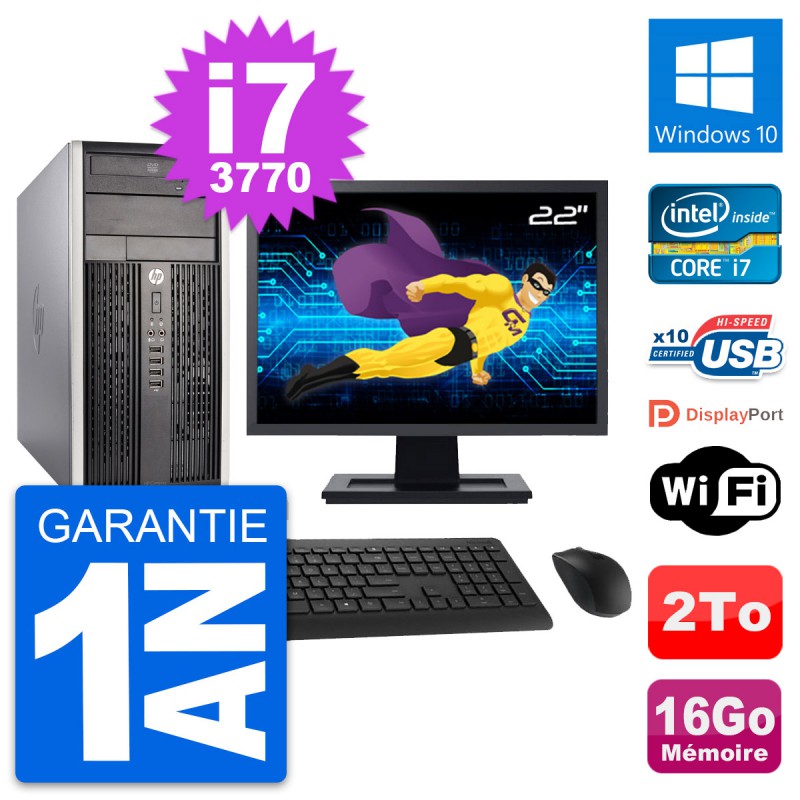 PC HP Pro 6300 CMT (Micro Tour) - Intel Core i7-3770 3.4 Ghz (8 Mo) - 16 Go DDR3 - Disque Dur 3,5" 2 To - Graveur DVD - Clef Wifi USB - Windows 10 - Livré avec Ecran 22" + clavier + souris (Marques et modèles variables) - Garantie 1 an.