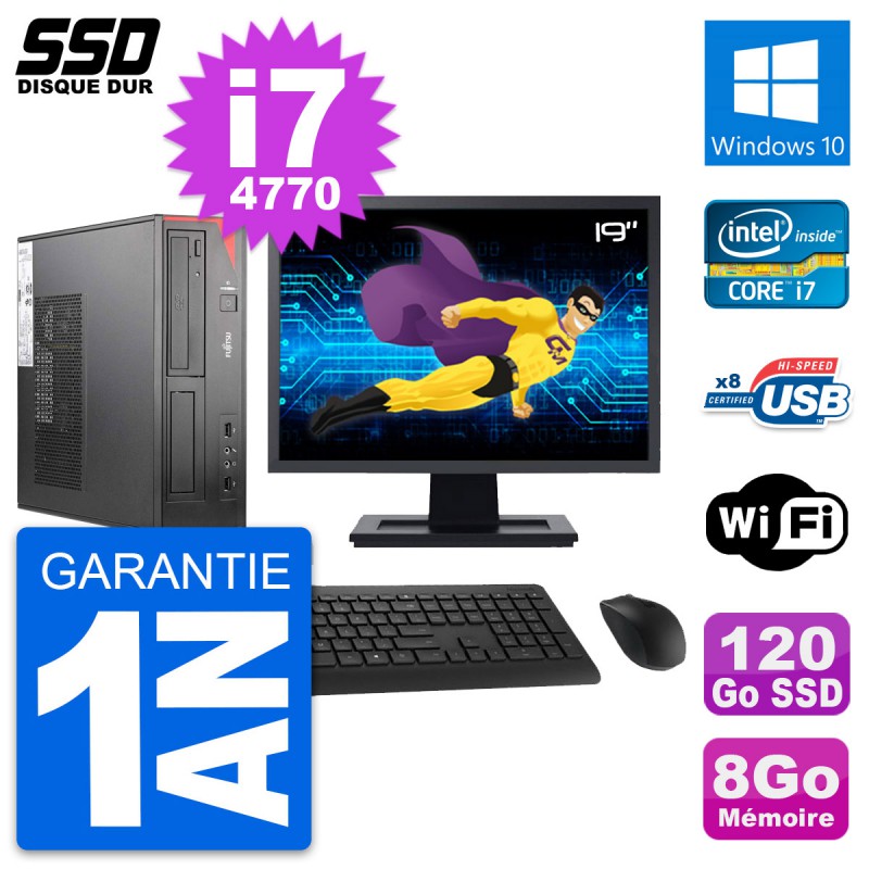 PC Fujitsu Esprimo E520 DT - Intel Core i7-4770 3.4 Ghz (8 Mo)- 8 Go DDR3 - Disque Dur SSD 120 Go - Graveur DVD - Clef Wifi USB - Windows 10 - Livré avec Ecran 19" + clavier + souris (Marques et modèles variables) - Garantie 1 an.