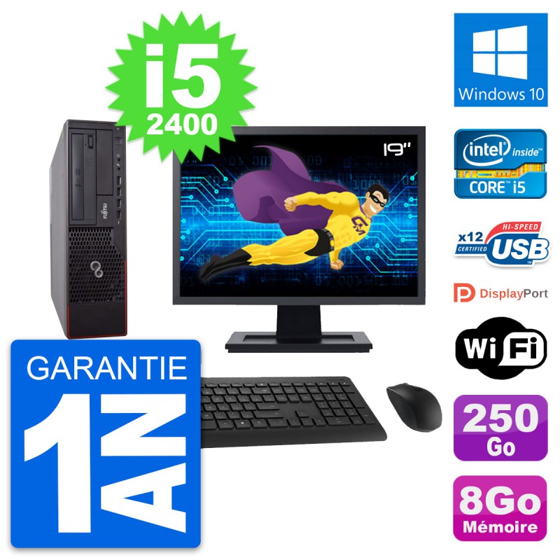 PC Fujitsu E700 DT - Intel Core i5-2400 3.1 Ghz (6 Mo) - 8 Go DDR3 - Disque Dur 3,5" 250 Go - Graveur DVD - Clef Wifi USB - Windows 10 - Livré avec Ecran 19" + clavier + souris (Marques et modèles variables) - Garantie 1 an.